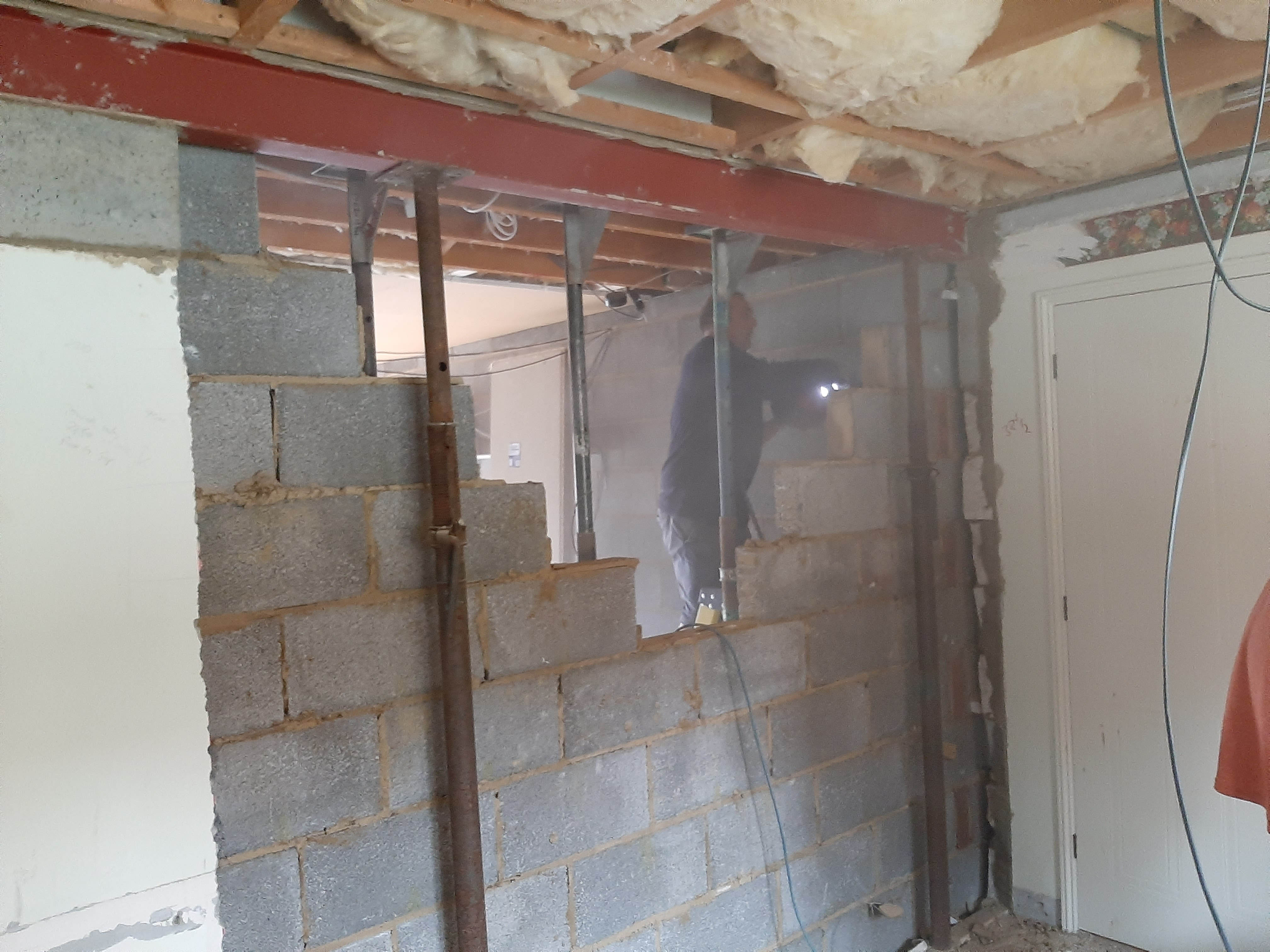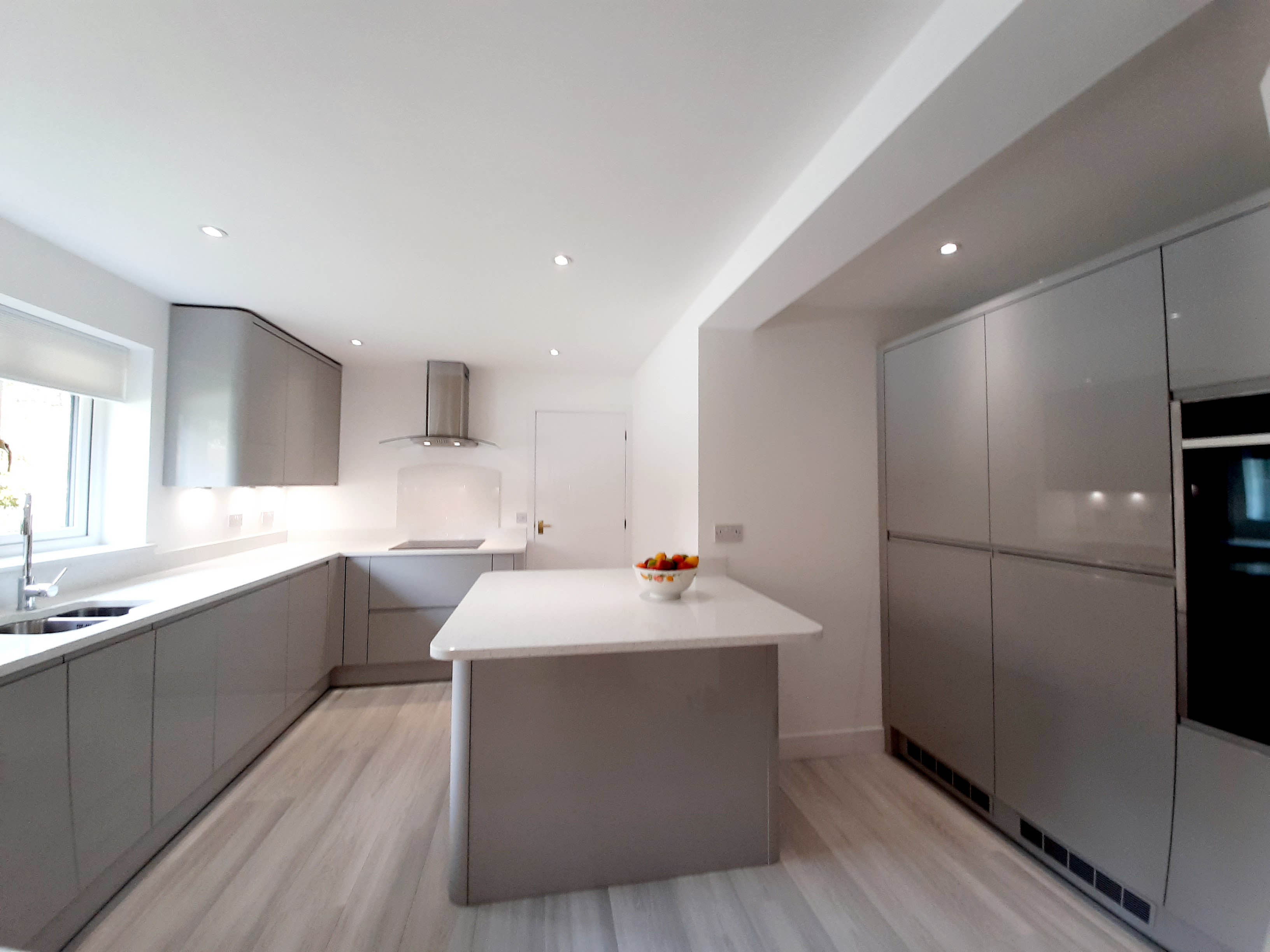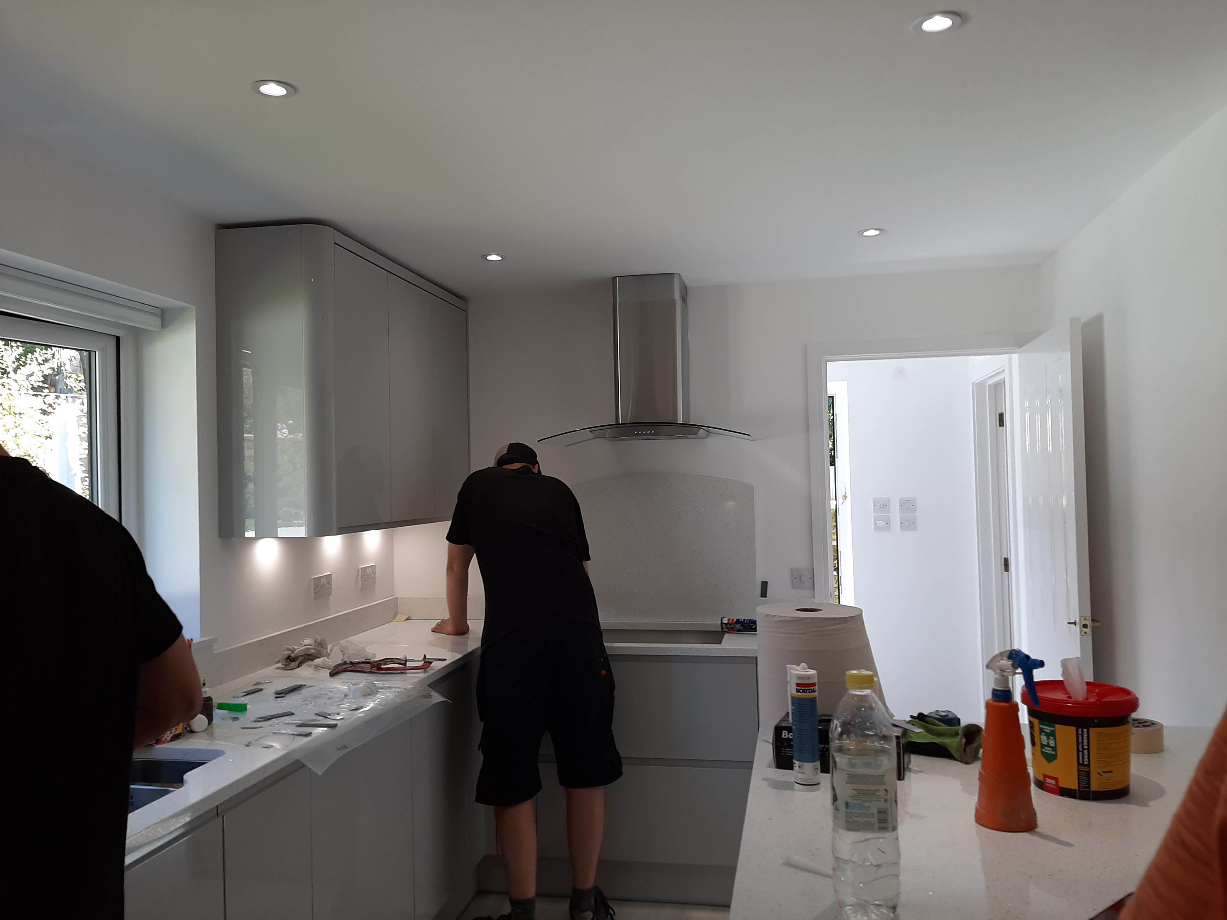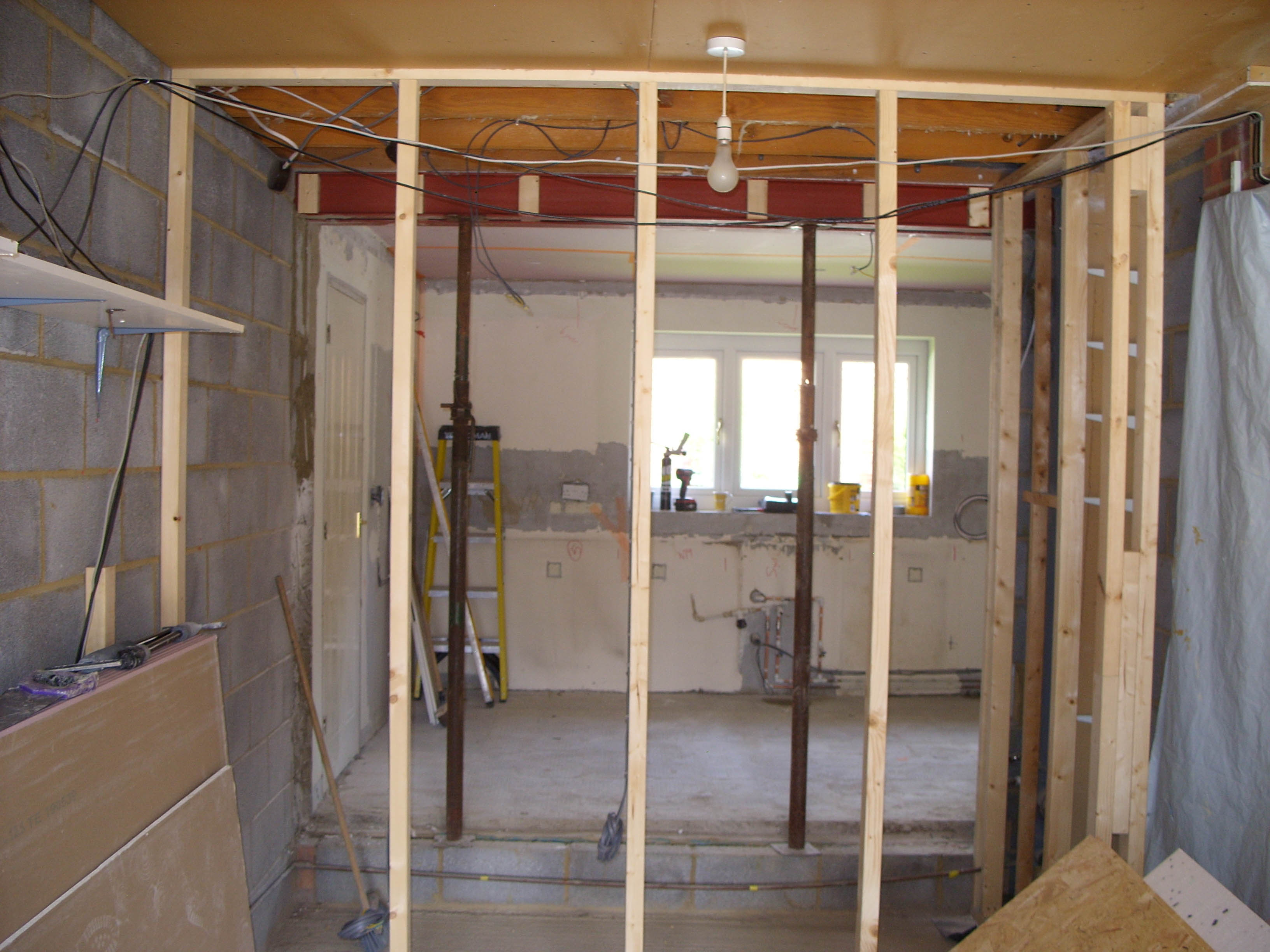 This project extended a section of the kitchen wall into the garage area, giving around four square meters of extra space, used for new tower units with fridge freezers and an oven. This created more overall space for storage. The photos show the progression from gutting the kitchen, taking out the wall, applying acrow props and plastering, floor laying and painting. Finally the cabinets and towers were installed and topped with 30mm quartz.The process took around two weeks from start to finish and the customer's comments can be seen on our Testimonials Page.