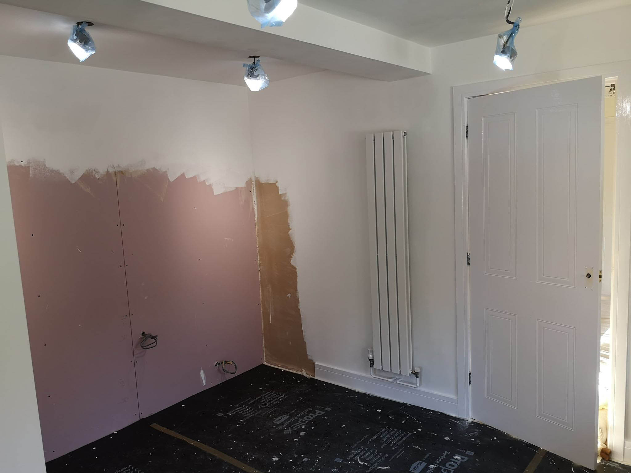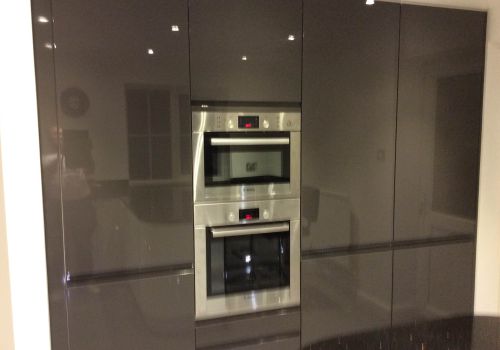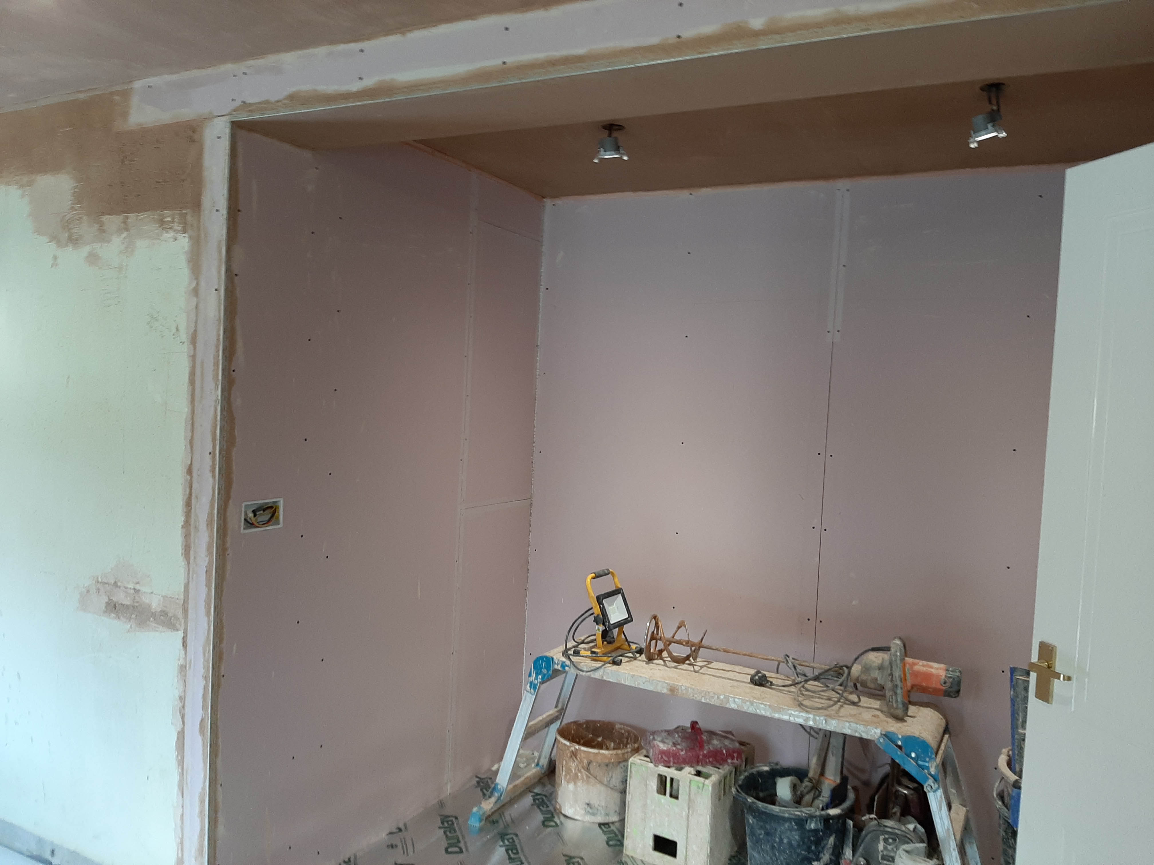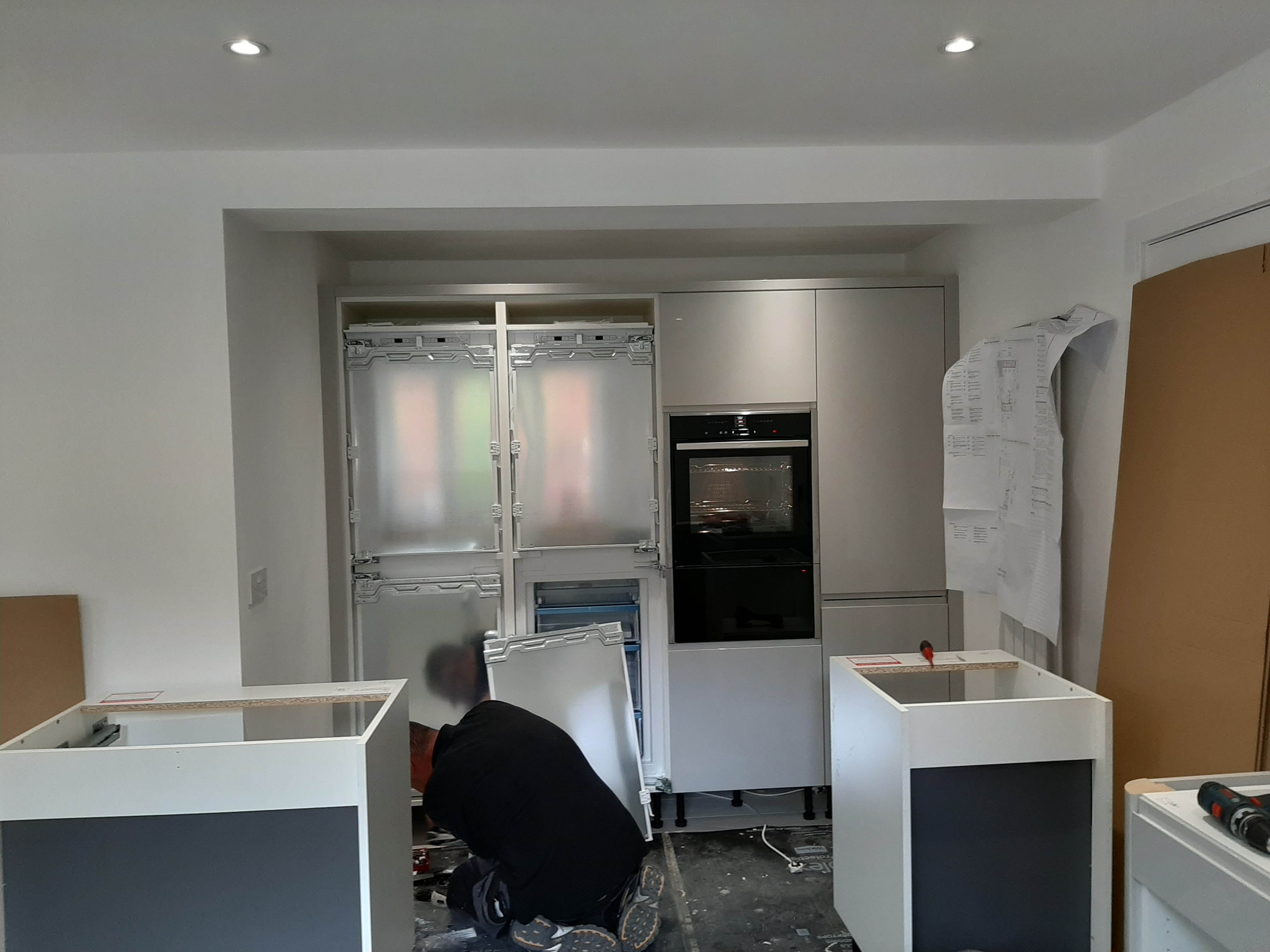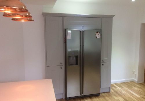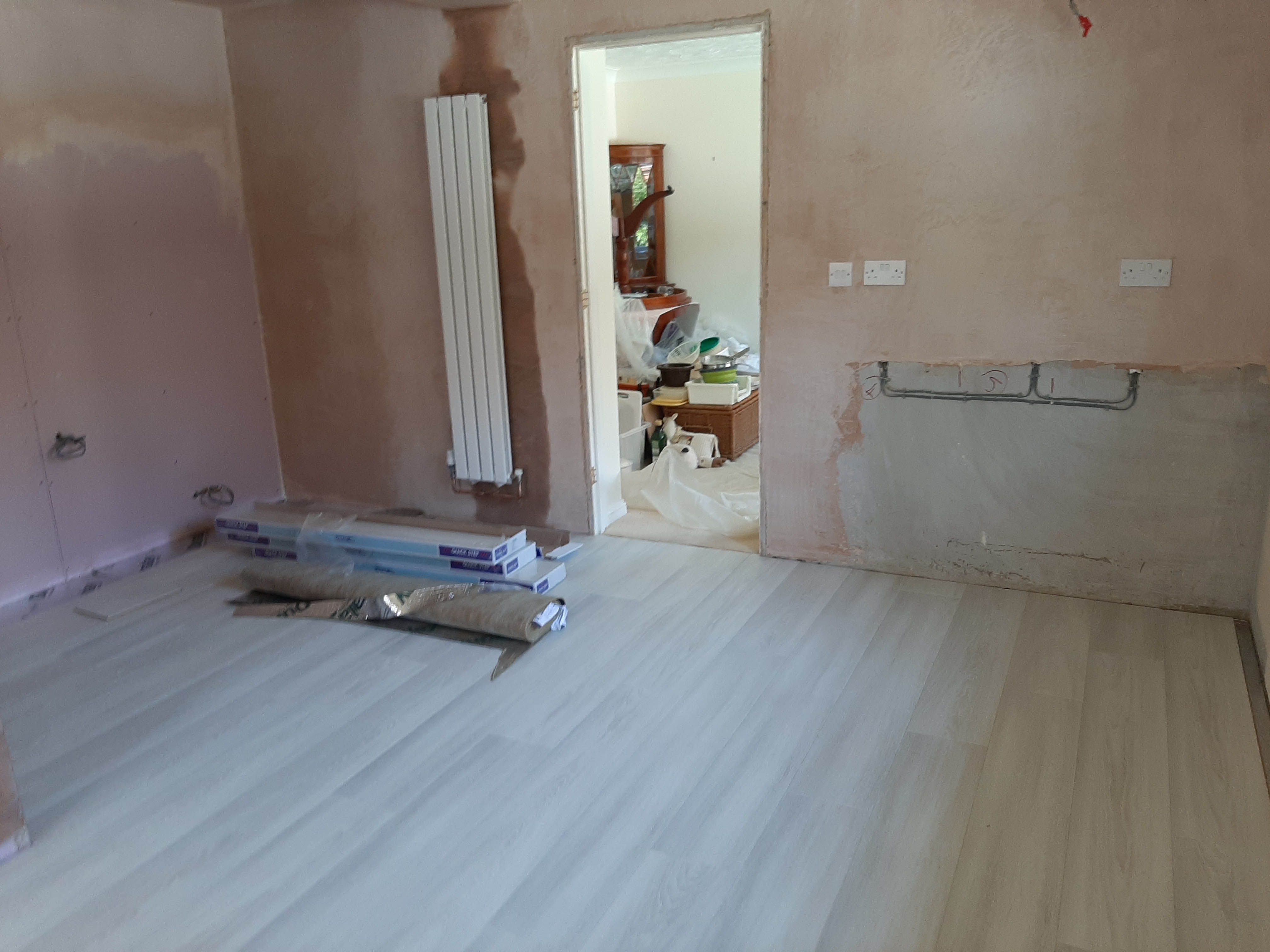 This project extended a section of the kitchen wall into the garage area, giving around four square meters of extra space, used for new tower units with fridge freezers and an oven. This created more overall space for storage. The photos show the progression from gutting the kitchen, taking out the wall, applying acrow props and plastering, floor laying and painting. Finally the cabinets and towers were installed and topped with 30mm quartz.The process took around two weeks from start to finish and the customer's comments can be seen on our Testimonials Page.