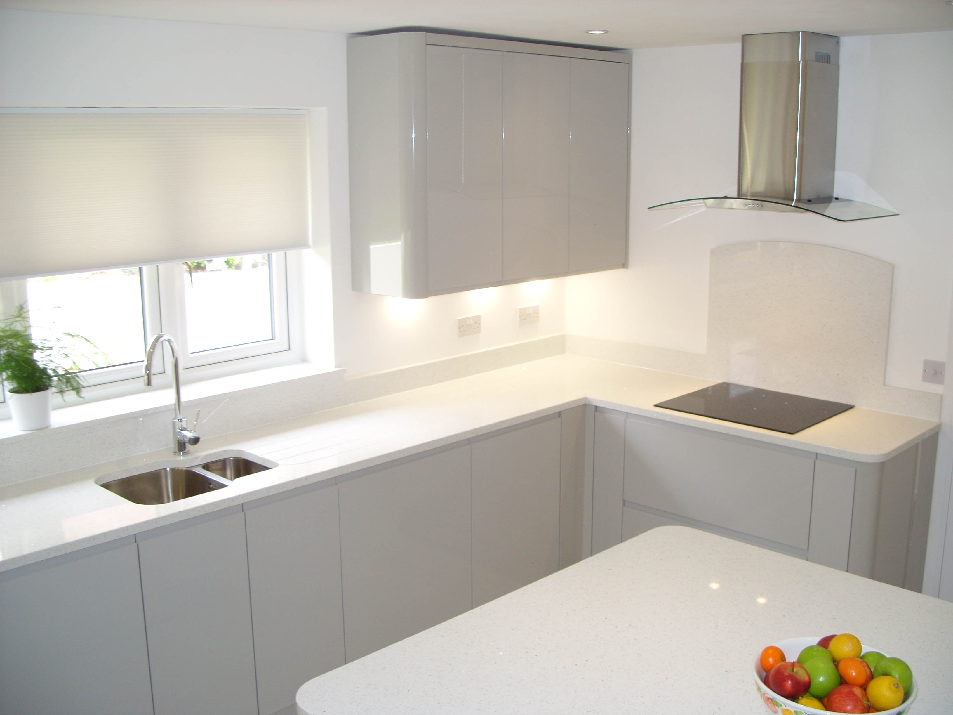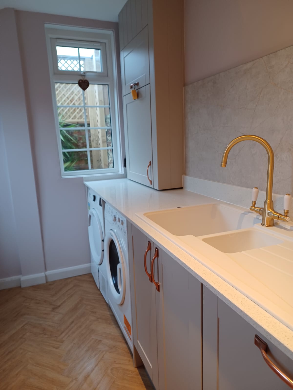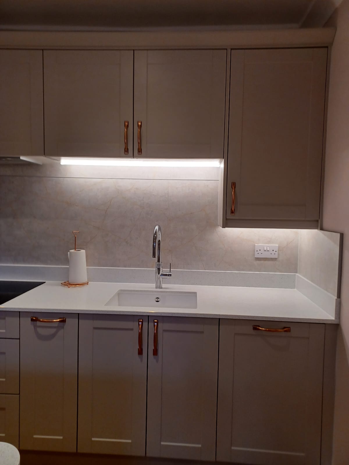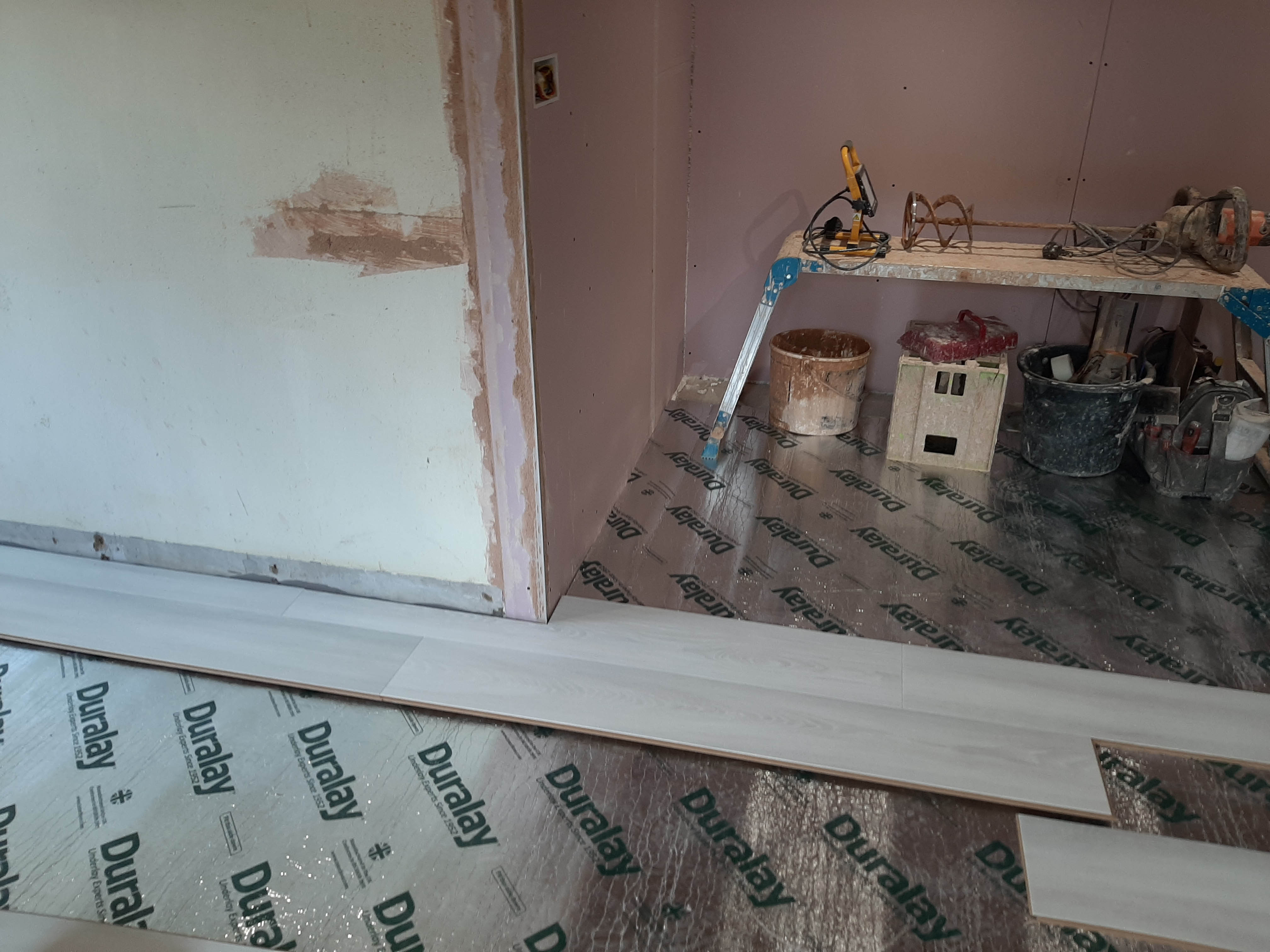 This project extended a section of the kitchen wall into the garage area, giving around four square meters of extra space, used for new tower units with fridge freezers and an oven. This created more overall space for storage. The photos show the progression from gutting the kitchen, taking out the wall, applying acrow props and plastering, floor laying and painting. Finally the cabinets and towers were installed and topped with 30mm quartz.The process took around two weeks from start to finish and the customer's comments can be seen on our Testimonials Page.