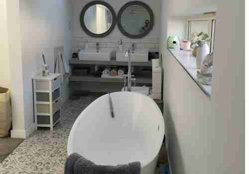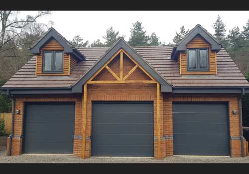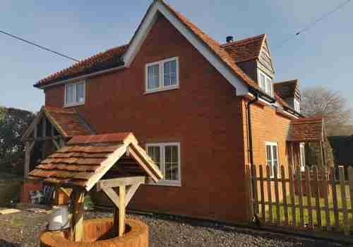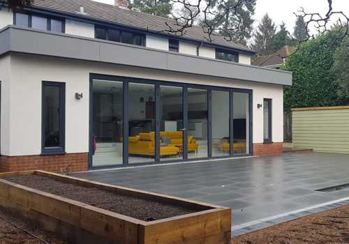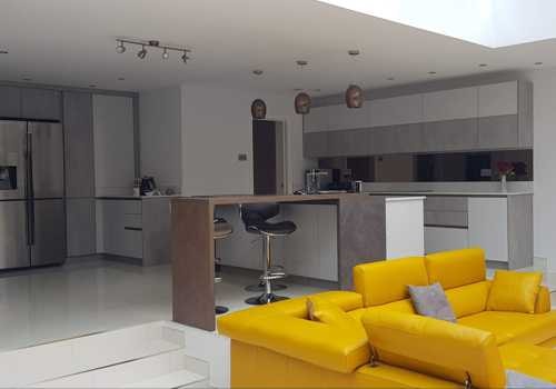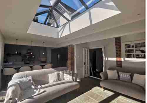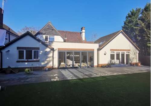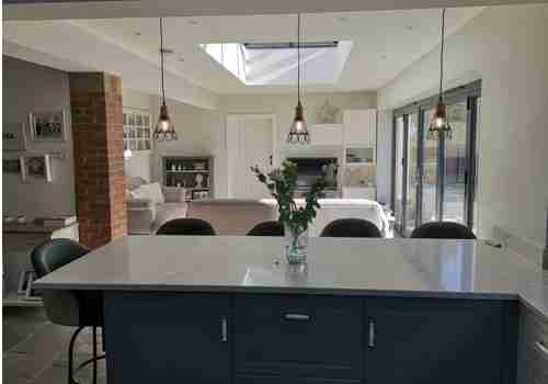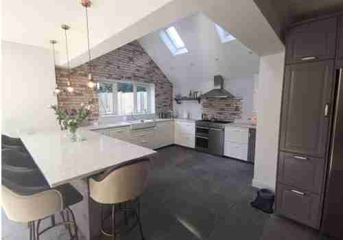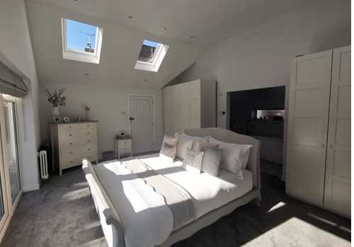 This second set of photos show new skylight windows fitted to create a feeling of space, together with a bespoke fitted kitchen and modernisation of the walls and ceilings. The team created a single storey extension and a a new triple garage with overhead office. And finally no renovation is complete without a bespoke fitted bathroom.